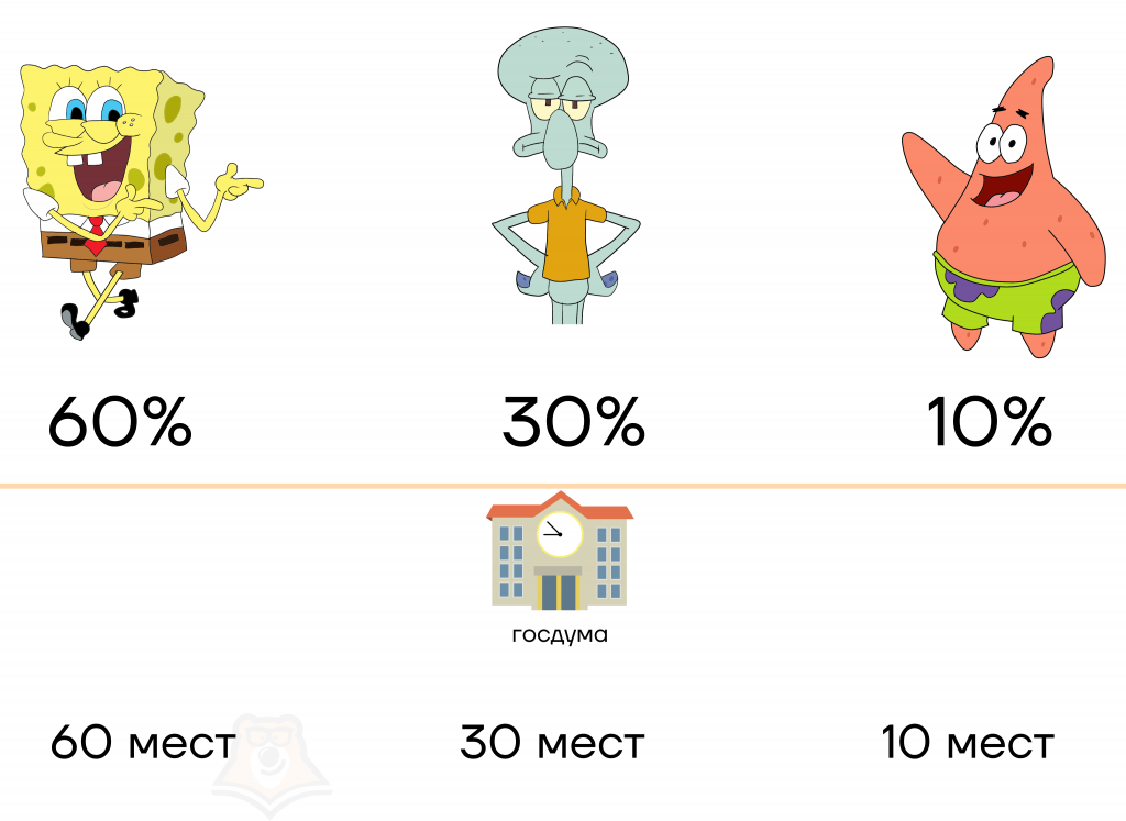| Спанч Боб, Сквидвард, Патрик — кто одержит победу на выборах? Итак, у нас выборы в Государственную Думу. В Думе есть 100 свободных мест, которые должны занять депутаты. У нас есть партии, которые планируют занять эти места: партия Спанч Боба, партия Сквидварда и партия Патрика. За партию Спанч Боба проголосовало 60% избирателей, за партию Сквидварда проголосовало 30% избирателей, а за партию Патрика 10% избирателей. Места в Госдуме будут распределяться между партиями в зависимости от того, сколько процентов голосов они получили. Получается так, что партия Спанч Боба получит 60 мест, партия Сквидварда получит 30 мест, а партия Патрика — 10 мест. |