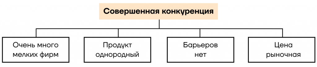 - В совершенной конкуренции множество фирм производят одинаковые изделия, контроль над ценой отсутствует.