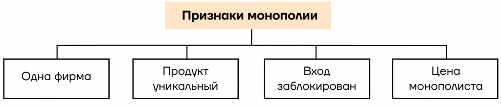 Рынок контролирует один производитель, который устанавливает цену выше, чем она сложилась бы на конкурентном рынке, и производит товаров меньше, чем производила бы отрасль в условиях конкуренции.