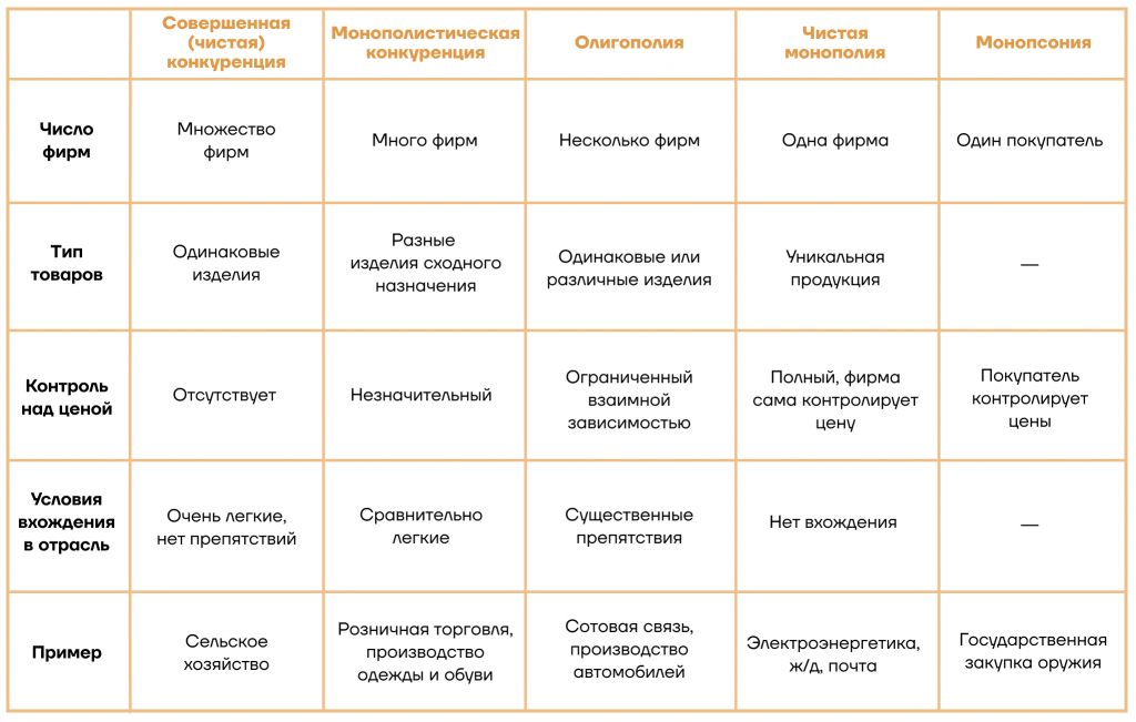 Запомнить признаки рынков по типу конкуренции можно с помощью таблицы: